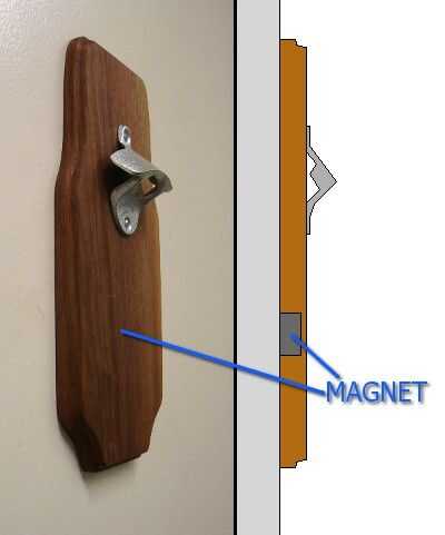 Este paso es otro proceso de diseño. Pensamos en dos opciones que funcionaron bien. La primera opción es Cincele una plaza en la parte posterior de la Junta para un imán de bloque grande. Se utilizó un 2 "x 1" x 1/2" bloque, nuestro número de parte BY0X08. Con este bloque grande, efectivamente mantendrá el abrelatas a la captura de acero y los tapones de botellas.