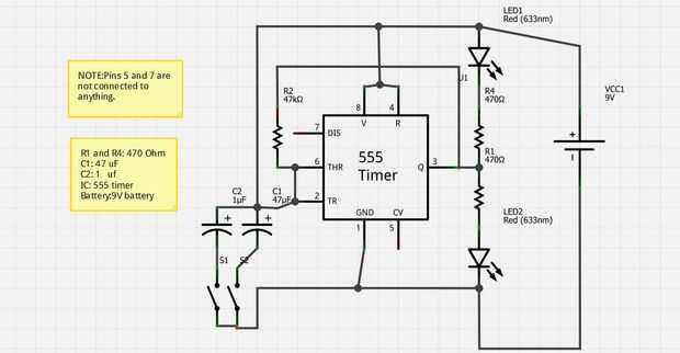 aquí está el diagrama del circuito.!Paso 1: Componentes necesarios 1) 2 led de diferentes colores2) condensador de 100uf3) 555 temporizador ic4) cablesbatería de 9v de 5)6) conector de la batería7) resistencia de ohmios k 1 18) resistencia de ohmios