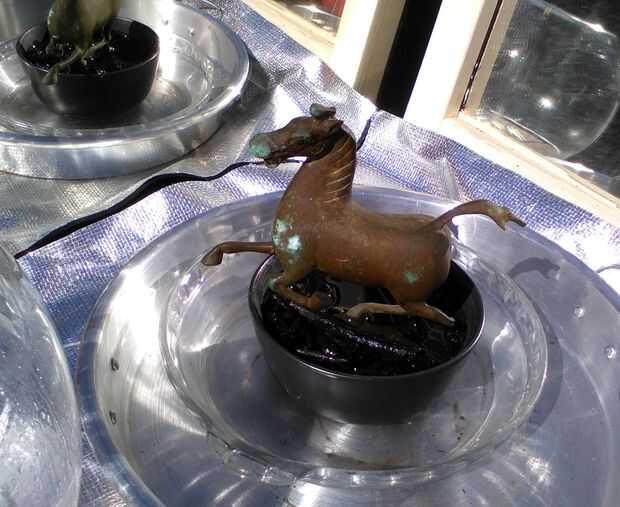 Cualquier figurita de pie metal o bloque de pie de metal si no hacer estatuas, va a capturar más calor del sol. Calentará el agua más que la sombra se proyecta por él. En los meses de invierno la estatua puede no aún proyectan una sombra en el recipiente, que es aún mejor.