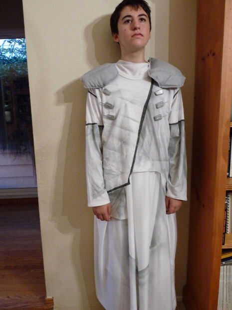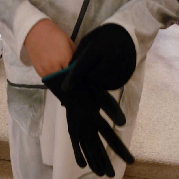 Blanco pantalones cortos. Manto. Chaqueta. Bajo campana. Campana exterior y máscara. Guantes negros.