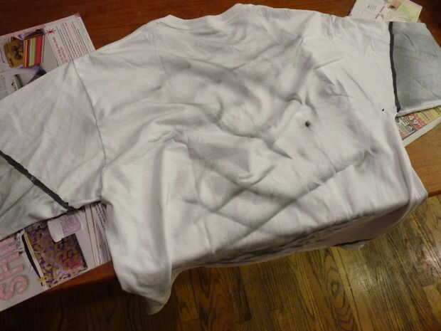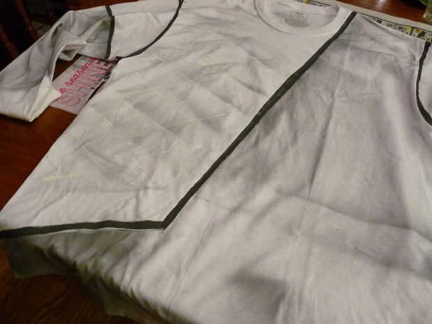 Usar la camisa blanca como base para la pintura funcionó muy bien. Usé una gran blanco camiseta manga larga y pintado con pintura en aerosol y acrílicos. Sólo necesitaba plata, blanco y negro.