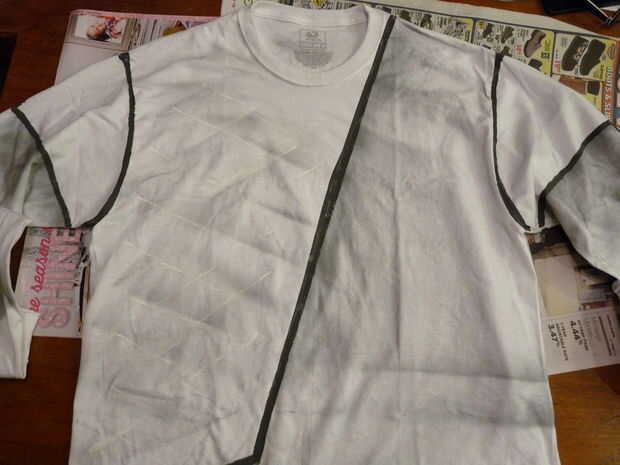 En primer lugar, enmascarados fuera de las áreas de pintura con la cinta. Luego rociar cuidadosamente patrones con pintura de plata utilizando como referencia fotos de destino. Cuando la plata seca, agregué detalles en pintura acrílica blanca y gris oscurezca. En algunas zonas que pude mantener una máscara de cartón (forma corta para ser el negativo de lo que está pulverizando) y rociador. Que es como conseguí el criss cruz patrón. Sin embargo, tuve una fantasía de enmascarar el patrón del diamante toda la camisa de cinta delgada. Si tienes tiempo para esto creo que se verá impresionante. Ir la luz en la fumigación.
