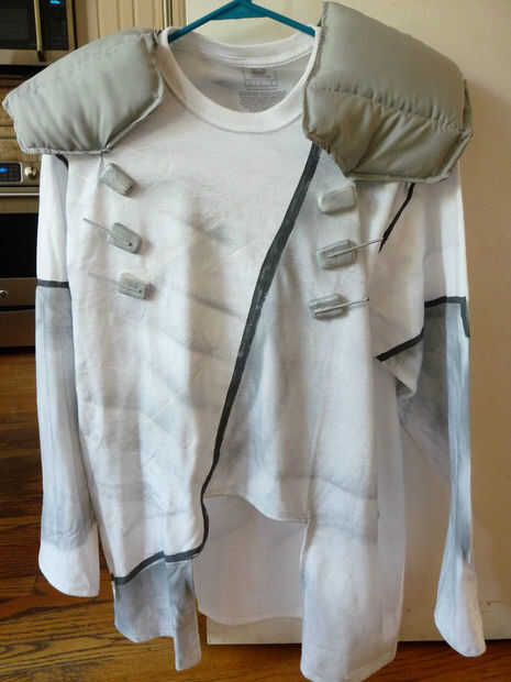 Cuando los cojines del hombro, coloque la camisa plana y ver donde los detalles de arcilla mira a la derecho. Pegamento en su lugar y asegure con cinta hasta que el pegamento se seca.