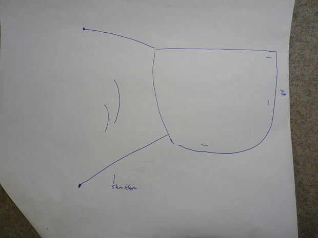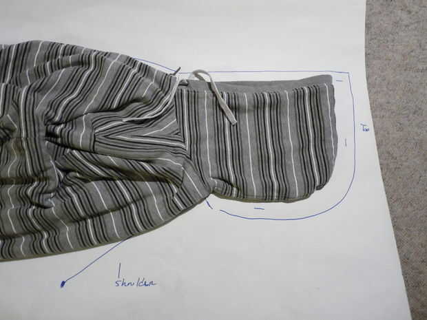 1) hacer una plantilla de capilla con una campana que se adapta. Coloque la prenda sobre un pedazo grande de papel o cartón. Dibujar una o dos pulgadas fuera de la prenda y se olvide de marcar los hombros. Dibujar un punto delante y detrás de los hombros. No hay necesidad de ser exactos.