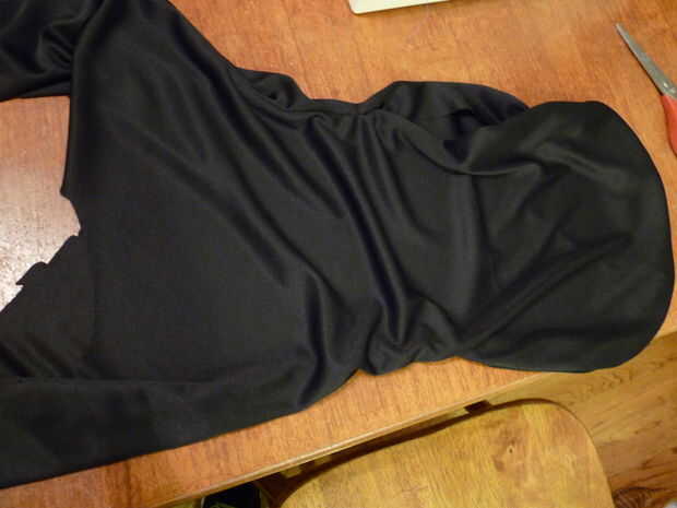 Me decidí a construir la capilla del negro en tres piezas. El bajo capó será la base. La campana exterior ocultará las correas de la máscara. Y la chimenea será la decoración en forma de V que viene sobre el pecho. La máscara se unirá sólo a la campana exterior.