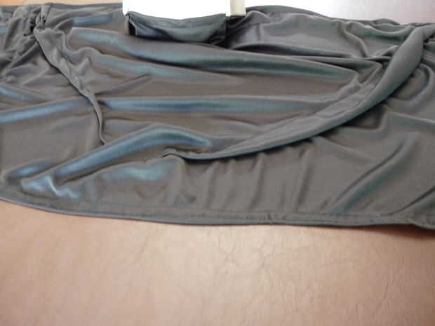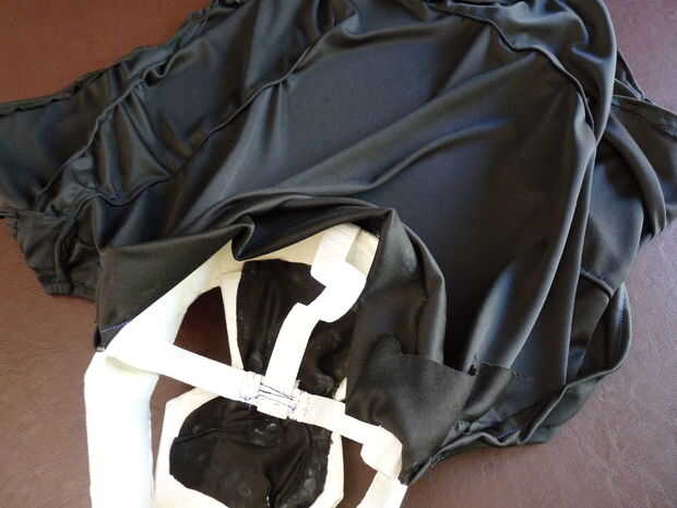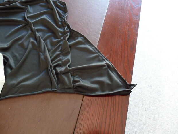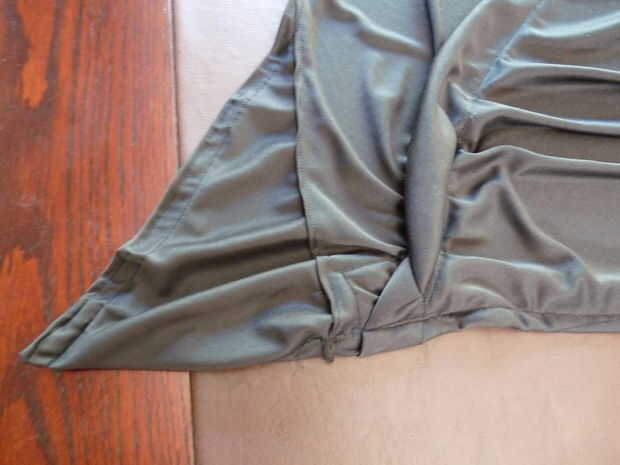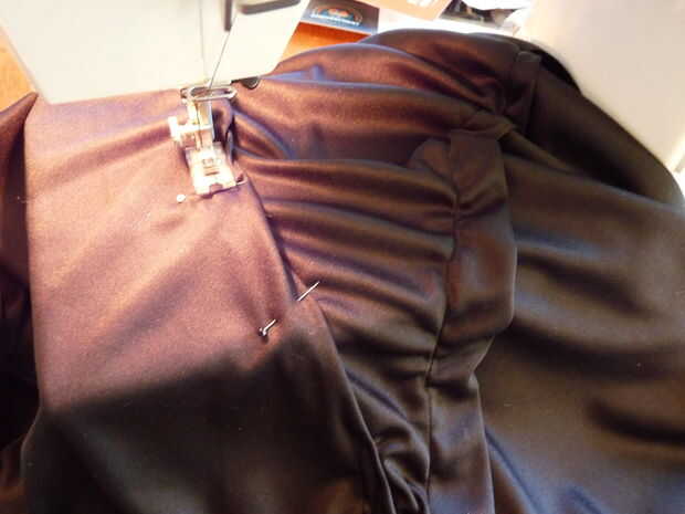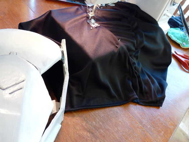 Cuando la cubierta externa se coloca bien es hora de formar en la chimenea. Esencialmente se hacen dos pliegues diagonales de la parte delantera a la parte posterior de cada lado. Me puso todo tan plano como sea posible sobre una mesa y comenzó a fijar los pliegues pliegues hasta la campana colgada correctamente. Usé una máquina de coser para los dobleces para asegurar una línea a lo largo de cada borde de la costura. Incluso con una buena cantidad de experiencia de costura, este trabajo fue muy difícil. La parte buena es, sólo puede mantener líneas diagonales coser hasta que quede derecho. El diseño y la tela son muy indulgente. Prueba tantas veces como sea necesario y realizar los ajustes.