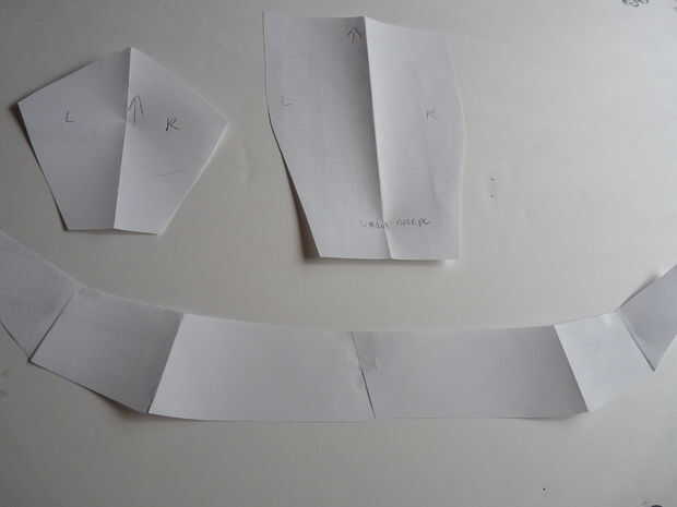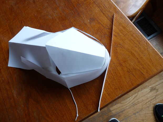 En última instancia, no necesito la máscara base plástica que compré. Sin embargo, voy a empezar por cortar papel y tratando de encajar estas piezas en la máscara de plástico en forma de máscara de un altavoz. Las formas corresponden a las formas de la máscara del orador. Vas a tener que jugar con ellos un poco, pero se puede ver lo terminó con. También se puede ver que doblé los papeles por la mitad para obtener formas y piezas simétricas. Estas formas de papel se convertirá en Mis plantillas.