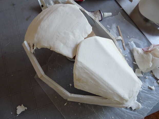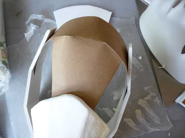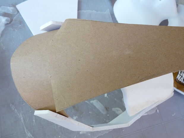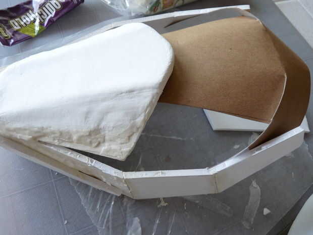 La base para esta pieza se puede hacer de cualquier cosa flexible. (Utilizar la base de la espuma como una plantilla, pero no en la máscara). Estaba buscando una botella de refresco grande cortar y terminó con un cartón delgado. Ya que será cubierto en pegamento y arcilla, no estoy preocupado por la estética.