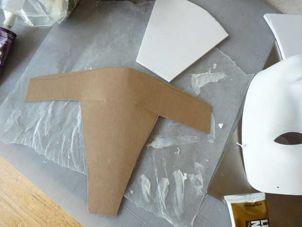 Usé el triángulo de la base de la espuma como una plantilla para la sección del frente. He añadido las lengüetas a la cartulina así que podría asegurar a los lados de la máscara. Después de cortar la forma de la sección de frente, me incorporé a la máscara utilizando solo cinta.