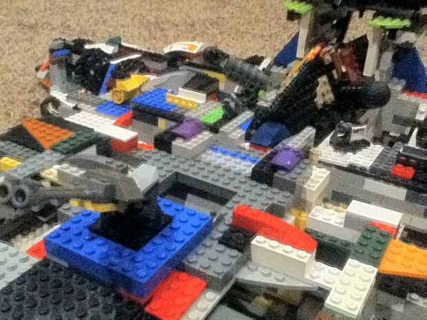 Esto es generalmente una parte puramente estética de la construcción, pero en este caso he añadido un cañón de la onda partícula grande situado directamente bajo el puente. Entre los misiles nucleares con resorte lanzadores es una estructura en forma de pirámide negro ocultando el cañón. Para construirlo utilicé técnica bares para hacer una especie de brazo paralelo que pliegues adelante hacia fuera por debajo del puente.