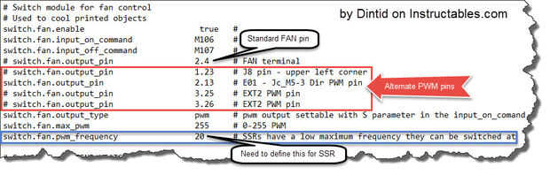 Se puede ver cómo he sin comentarios el estándar pin ventilador 2.4 y habilitado el pin pwm en E1; 2.13.