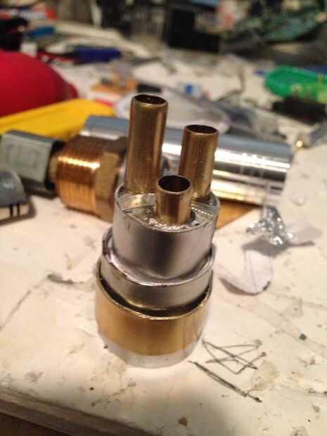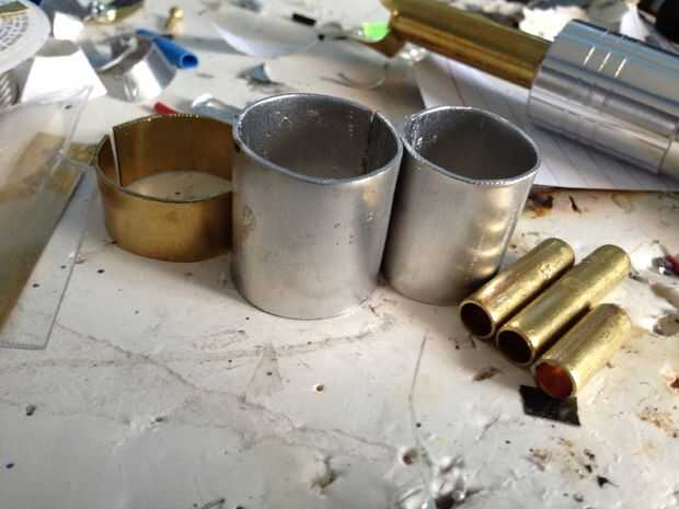 La parte principal de la parte delantera del destornillador del laser fue hecha de la hoja de aluminio y latón, en forma de tubo. Una versión mejor y más precisa se podría haber hecho con tubos de aluminio grande, pero no he encontrado lo económico para comprar un tubo de aluminio de 3 pies cuando sólo voy a usar una pulgada de él. Pegué tres pedazos de tubería de latón pequeño en el extremo. Te recomiendo usando pegamento caliente porque es transparente, dejando que la luz a través de y difusión bien.