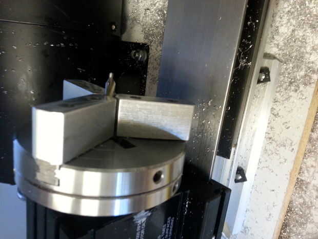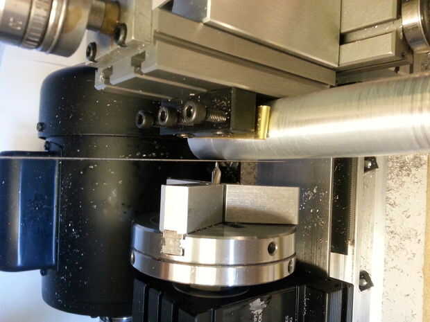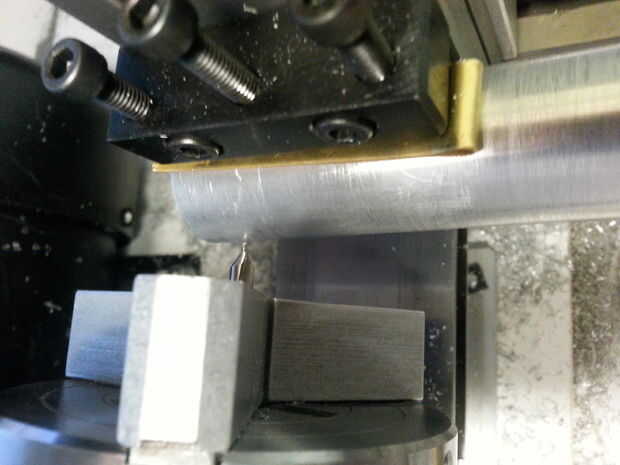 - colocar la pieza en la mordaza de la fresadora con una pieza de bronce a lo largo del borde superior