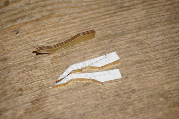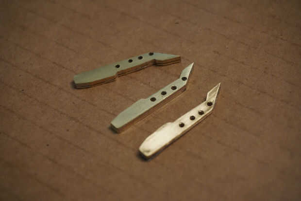 Entonces tomó un trozo de hoja de cobre y había intercalada entre dos hojas de latón con resina y había pegado tres diseños a un lado del sándwich.