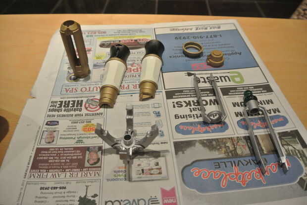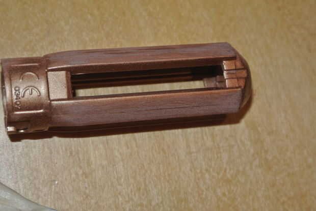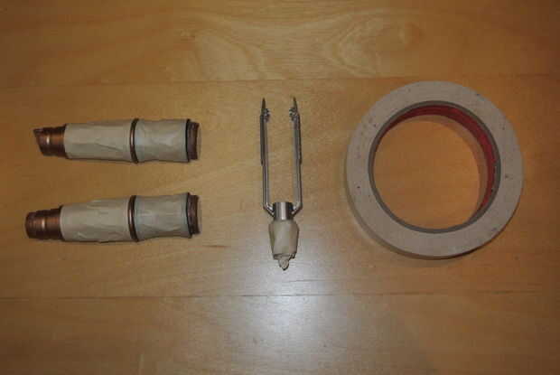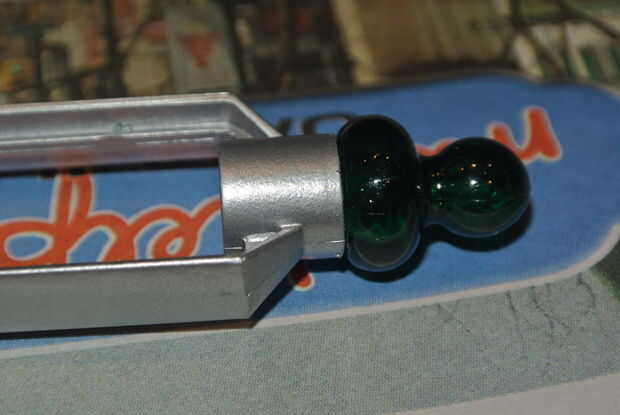 Antes de pudiera pintar, sin embargo, que necesitaba cubrir todas las piezas que quería conseguir pintura en. Estos fueron principalmente la "cerámica" parte de la empuñadura y la punta del emisor (pieza verde claro). Utilicé cinta adhesiva estándar y que en todas las curvas poco.