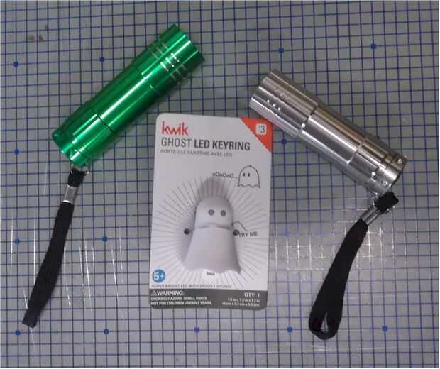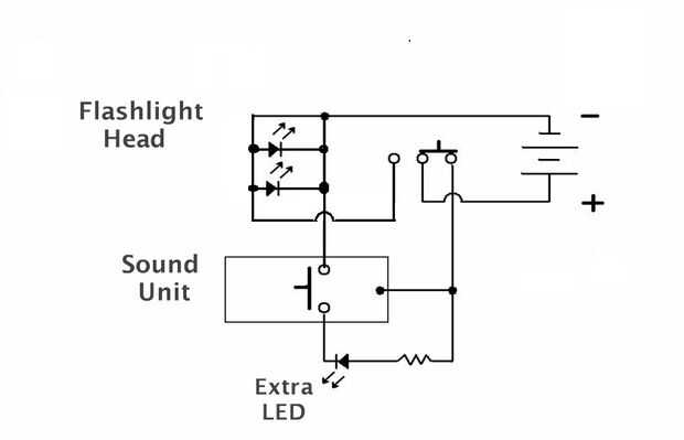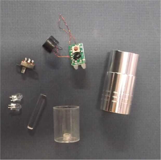 Encuentran la mayoría de las partes en blanco en la sección de dólar en la parte delantera de la tienda. Las linternas son casi perfectas para esto. El sonido viene de un llavero en la misma sección. El resto de las piezas son cosas que ya tenía. Las linternas que utilicé fueron diferentes diámetros. Esto hizo fácil. Pero podría usar dos del mismo. Sólo rodar una manga interna de algunos metales blandos y usarlo para conectar las dos mitades.