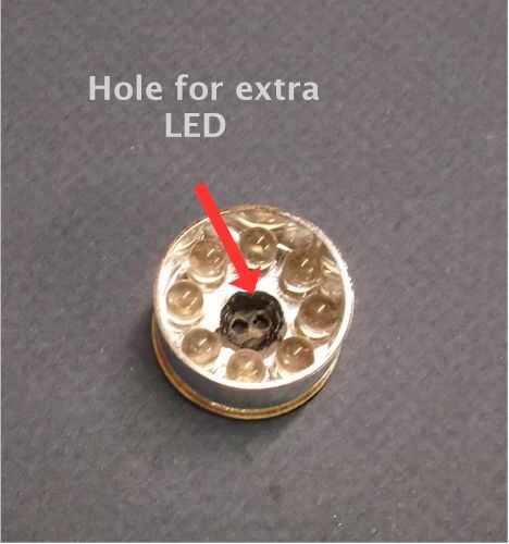 Retire el centro LED de la placa de linterna. Agrande los orificios para cables a través. Aislar la parte posterior del tablero con... Qué más... líquido de la cinta. Dejar uno negativo y uno positivo punto abierto. Perfore un agujero en el centro de la lente que se va a utilizar en la linterna. Hacer el agujero lo suficientemente grande como para caber los cables y un LED.