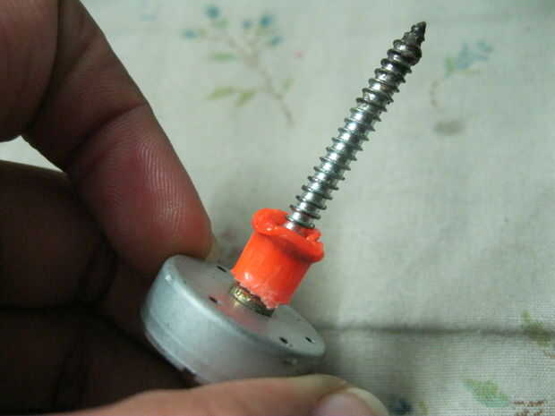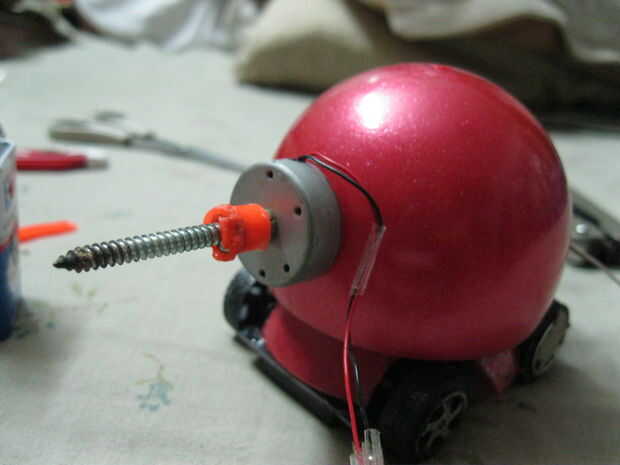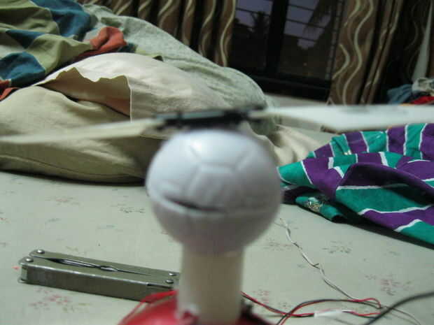 esta es la parte que es un poco complicada. Poner uno de los motores en la bola de plástico. su eje debe b visible a través de la hole.attach la hélice al motor de la outside.here un pic.take la hoja del afilador con el destornillador y pegamento a los bordes de la hélice según la dirección en que van a girar. tomar el otro motor y pegarlo justo en frente de la cúpula o belly.take el tornillo y pegarla al eje de la motor.now que está cerca el fin de hacer este robot.