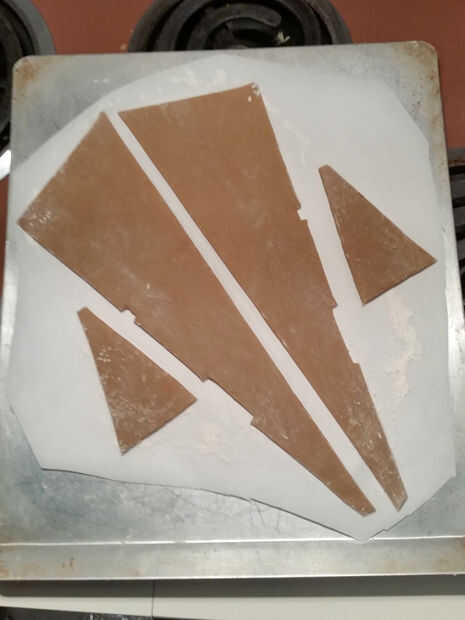 Hay decenas de recetas de pan de jengibre estructural disponible en línea, cada uno un poco diferente de la otra. Después de examinar y comparar varios, decidí mezclar mi propia, utilizando: harina, azúcar moreno oscuro, mantequilla o margarina, melaza y sal. Usando una cantidad generosa de harina, estirar la masa a 3/16"+-gruesa sobre papel sulfurizado, colocar las plantillas de papel de corte en él y cortar lejos usando un cuchillo o un cortador de pizza.