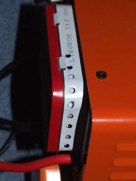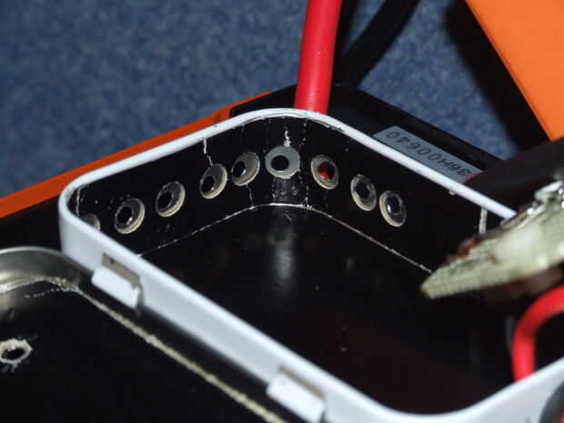 Los cables de salida sale de un agujero de 5/16" en el lado izquierdo, y en este agujero cabrá un ojal de goma de 1/4". Comience con poco e ir poco a poco hasta en tamaño con los pedacitos de taladro, el metal es fino y suave y fácilmente. Quitar el flash con un poco de avellanado, si tienes uno, o una broca más grande trenzado con los dedos. Use algo redondo y duro, como el extremo del eje de una gran broca o punta de un pequeño martillo de bola, para aplanar los agujeros después de la perforación. No olvide dejar espacio para la tapa que sobresale por los lados de 1/4" o algo así.