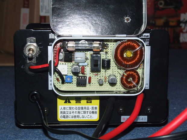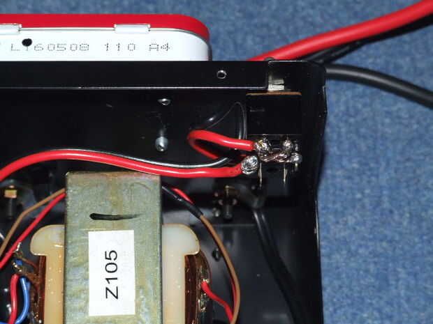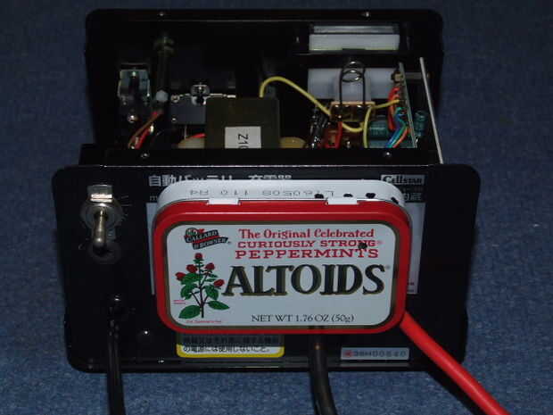 Usted necesitará perfore seis agujeros, un 5/16" diam de la lleva a introducir el cargador, una 1/2" diam para el interruptor (Si utilizas el mismo interruptor de estilo que he usado) y cuatro agujeros de 1/8" de diámetro para los remaches pop. Perfore un agujero de remache pop, poner en un remache pop y Monte la caja en el cargador, luego taladro y pop-remache los tres agujeros restantes en sucesión. Tenga cuidado con los fragmentos de metal y fondo sople su cargador con aire comprimido después de que termines de perforación y formar los agujeros. También ten cuidado con que las brocas accidentalmente no dañan nada dentro. Un cable se enredó en un poco cuando lo hizo y tuvo que ser reparada más tarde.