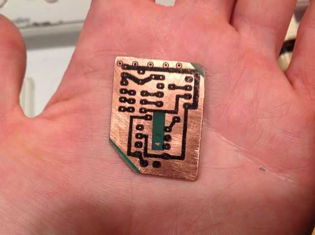 Para grabar la Junta, primero hacer que la capa que resiste el ácido dibujando los rastros de circuito en pintura o en un programa de diseño de PCB dedicado. He hecho mía en pintura solo transfiriendo el esquema en rutas reales de rastros, con el espaciamiento correcto de los componentes (véase el cuadro por ejemplo). Si elige el método de transferencia de toner, imprimir esto del lado cerosa de algún adhesivo papel utilizando una impresora láser (inyección de tinta no funciona) en la posición más alta de densidad de toner - este se encuentra en las preferencias de la impresora, que pueden ser en línea. Tuve que ajustar el tamaño por ciento que mi foto impresa en conseguir el componente correcto espaciado. Después de que ha impreso, compruebe que las patillas del componente se alinean con las almohadillas de calientan de la plancha de ropa a un fuego medio-alto. Mientras calienta, limpiar la placa con acetona y fijar el papel en la parte superior. Sostiene el papel firmemente para que no roce, presione suavemente la plancha sobre la superficie. Hacer unos cuantos pases, presionando fuertemente. Después de un par de minutos, coloque la plancha a un lado para enfriar y empapar la Junta en agua para desprender el papel. Después de 10 minutos, retire el papel. Si todo ha funcionado, tienes un circuito de resistir! Si no funciona, no te desanimes - tuve que intentar varias veces para conseguir mi técnica correcta y evitar aplastar el toner excesivamente.