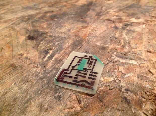 Después de aplica su resistencia, es hora de ensuciarse las manos y preparar el tablero. Este es uno de los más divertidos las partes de la creación de circuitos. Ver video de NurdRage en circuitos grabadores y entonces escoger cualquiera uno más le convenga. Mayoría de la gente utiliza cloruro férrico o ácido clorhídrico con agua oxigenada, pero como tuve a ni unos ni otros, he usado ácido nítrico diluido, como NurdRage describe en su video. Coloque la tabla en el grabador y dejó es sentarse durante unos minutos, seguimiento del progreso del grabado. Una vez que se haya quitado todo el cobre, sacar la Junta (y use guantes!) y lavarla en agua. Esponja la etch apagado con alcohol o acetona y admirar su obra! El cobre será muy agradable y brillante!