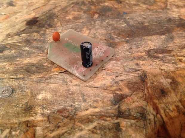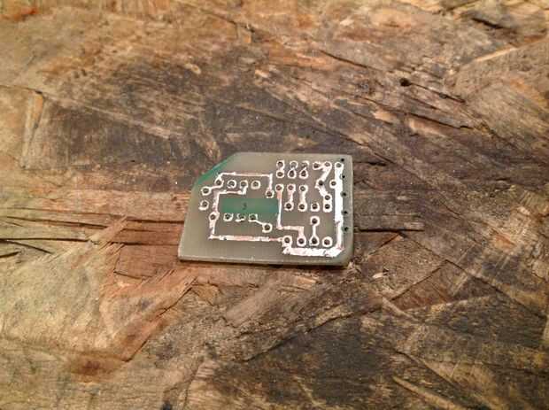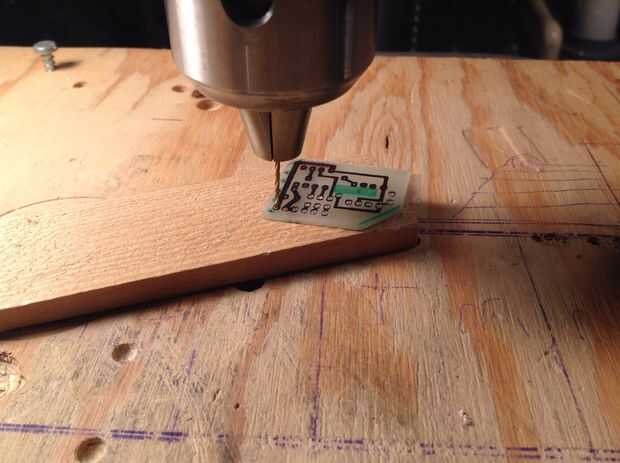 Con su placa grabada para dejar al descubierto el cobre bastante, ahora puede empezar a construir el circuito. Para empezar, perfore agujeros para todos sus componentes en las almohadillas. He utilizado un taladro de metal y madera de 3/64" bits, pero estoy seguro que una broca adecuada de circuitos podría funcionar mejor. Yo no tenía cualquier tamaño más pequeño disponible.