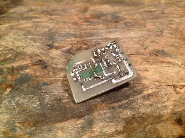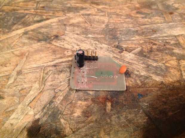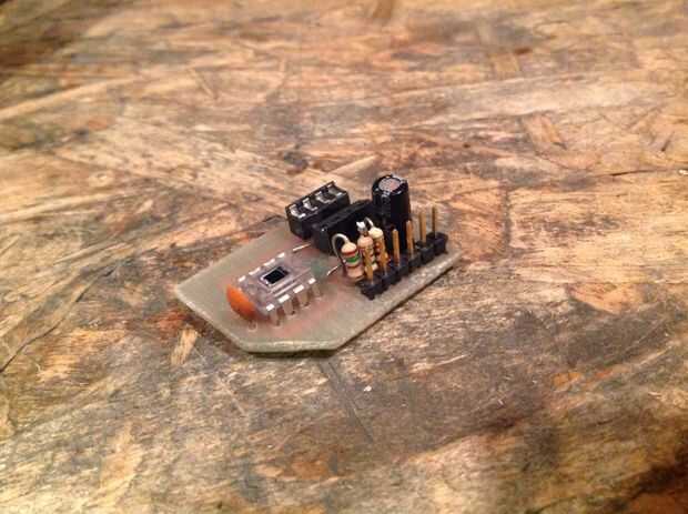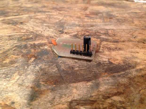 Ahora realmente puede rellenar la Junta. Siguiendo las instrucciones en la construcción del circuito del paso 3, agregar los componentes. Proporciona imágenes del proceso. Población es bastante simple - sólo encontrar un componente, salte en su lugar, comprueba que tienes derecho y luego las puntas con la plancha de calor y aplique una pequeña cantidad de soldadura. He encontrado que al agregar los pedacitos de cut-up de la gran toma de IC para el ATTiny más pequeños, que ayudó a poner el chip en las piezas de toma para asegurar la alineación correcta.