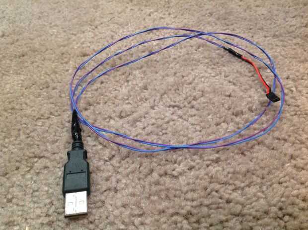 Mientras que usted está de soldadura, coloque una dos mujeres pines en los cables rojo y negro viene del enchufe del USB. Asegúrese de extender el cable, si es necesario, para que tu luz de teclado puede extender desde el puerto USB de su ordenador a su monitor (o dondequiera que usted elige montarlo).