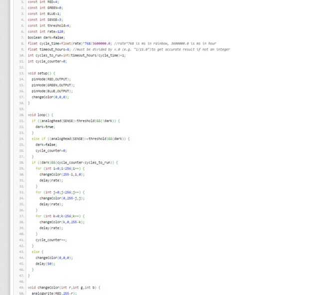 La línea 26 es parte de la parte más complicada e impresionante de este programa. No quería que mi luz teclado permanezca encendida toda la noche (porque soy raramente para arriba en el 3:00 en el equipo), así que decidí agregar algunos pizazz con una función de apagado automático. Tuve que probar varios ángulos de abordar el problema antes de que encontre uno que trabajó. Las funciones de tiempo transcurrido no parecen hacer el trabajo, y como el ATTiny no tiene un reloj en tiempo real, que no podía leer el tiempo. Este sistema funciona calculando el tiempo que toma hacer un arco iris en línea 8. Luego, en el número de horas de entrada como el tiempo de que la luz debe permanecer en la base, calcula cuántos arco iris debe terminar después de que oscurezca. If instrucción antes de que el programa de ranbow principal (línea 28) comprueba si es oscura y también comprueba que el programa tiene todavía más arco iris para ejecutar. Línea 41 incrementa el contador de cada arco iris. Y por último, la línea 26 restablece el contador de ciclo de arco iris cuando se convierte en luz.