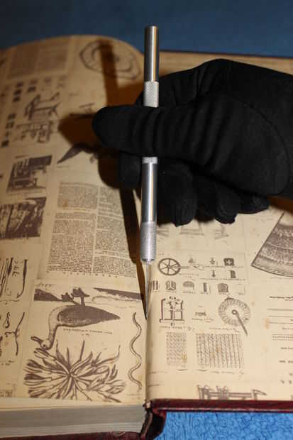 Trabajando desde una cubierta a otra, rebanada a lo largo de la costura de las páginas finales con el cuchillo del exacto.