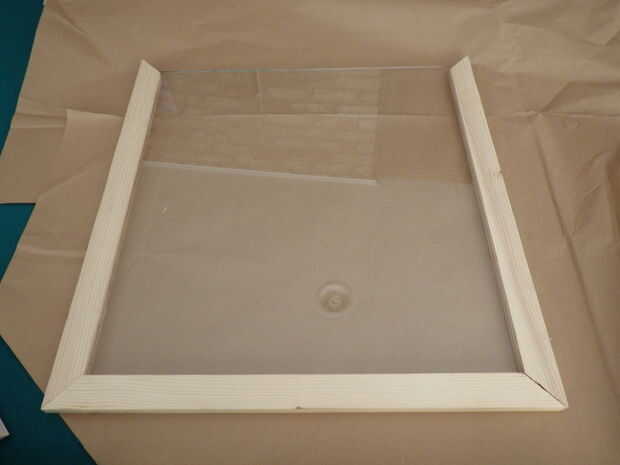Consigue un trozo de vidrio cortado al tamaño y tu tienda de mejoras para el hogar. Tuve la buena gente de OSH hacer por mí y cortan el vidrio perfectamente a mi medida. El tamaño del vidrio será (el ancho de la abertura del marco + 1") x (la altura de la abertura de ancho + 1").