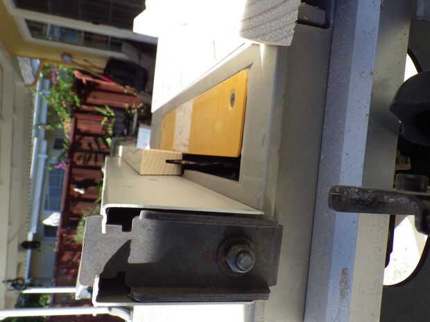 Empuje la pieza que desea acanalado a través de la sierra con una tercera pieza de madera de desecho nunca en mano!!!!!! Nota 3ª sola pieza de madera de desecho que no se muestra.