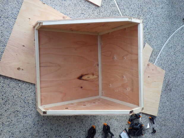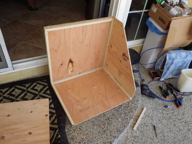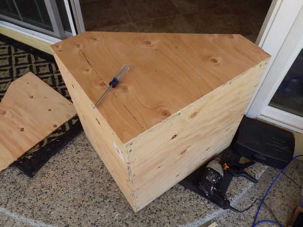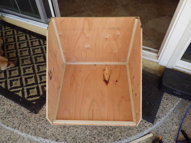 Vamos a empezar este paso girando a avances previos en su lado por lo que podemos agregar al lado de la parte superior. El lado que es 24" va por el lado de 24" de su progreso en la caja. Y 20" con 20". cuando su ras, nivel y 90 grados Sujete la pieza de lado a la caja utilizando los soportes (ocultados en cuadro, mira en otro en este paso para ver que apoya a 3/4") en ambas esquinas. (Si tienes largo 24"+ abrazaderas usted puede fijarlo con la abrazadera en otras partes también.) Luego perfore los agujeros piloto y enroscar los tornillos de 1". Su caja deberá verse ahora como la segunda imagen. Tenga en cuenta los soportes. Esto es donde usted perforar y utilizando a la abrazadera a.