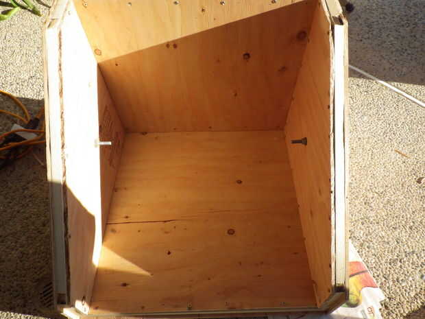PASO opcional: con su medida de lados Pentágono 6" y 6" y perfore un agujero para pasar un 1/2" espesor x 3" Perno largo con una arandela a cada lado y una tuerca agujerearlo en su lugar como se muestra. Este tornillo y el otro en el otro panel lateral pueden sostener una bandeja inclinable así puede girar el horno todo hacia arriba y hacia abajo para tomar más sol. No estar haciendo esto ahora pero quiero mantener la opción para el futuro así que me voy listo para él.