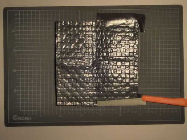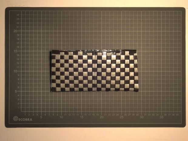 Si no quieres una cartera tejida pero un solo color, uno que simplemente puede hacer una hoja de cinta superponiendo tiras de cinta (lado pegajoso hacia arriba, aproximadamente 1/3 de la superposición de ancho de cinta), a continuación, cubrir con más cinta (lado pegajoso hacia abajo).