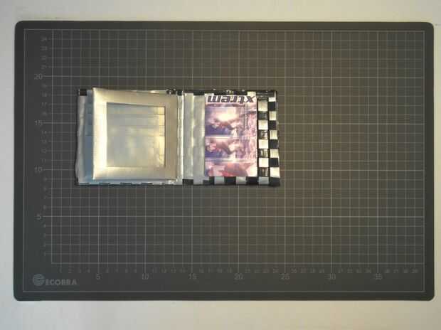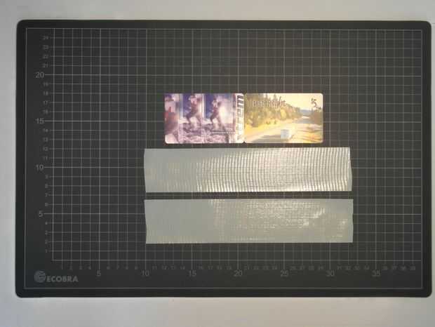 Añadir otra tira de superposición de cinta para ampliar el "túnel de cinta". Alternativamente puede fijar primero las tiras de cinta uno al otro y luego envuélvalos alrededor de las tarjetas de crédito.