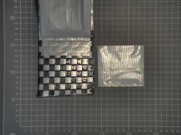 Tomar una tira de cinta de plata mientras que la apertura de la bolsa y coloque una parte de ella