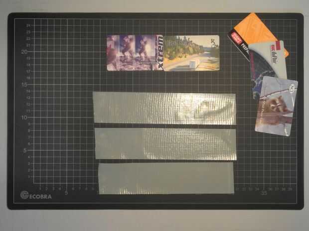 Tomar tres tiras de cinta un poco más de dos tarjetas de crédito son amplias.