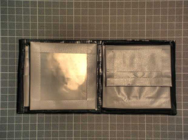 A continuación he utilizado tiras de cinta negra a 'frame' la billetera entera, enmascarar los bordes expuestos de las piezas de cinta de tejido y de la plata a los lados.