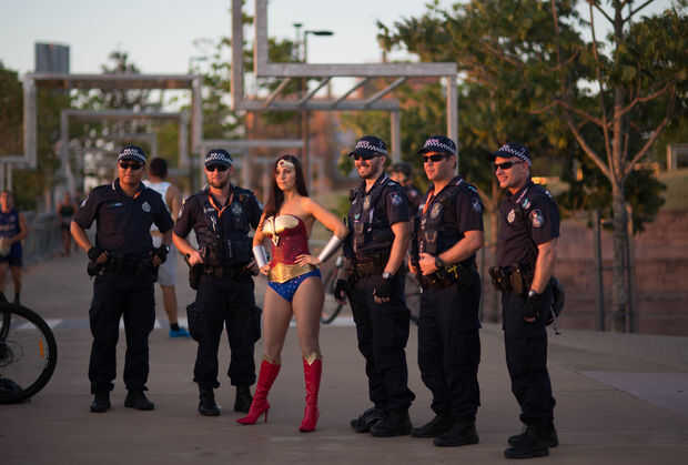 Sacó el disfraz y fue maravilloso. Actualmente la reunión del mundo del G20 se celebra aquí en Brisbane con todos los líderes del mundo representados. La ciudad está plagada de policía y fue bueno ver la alegría de su cara hasta cuando vieron caminar a lo largo de la mujer maravilla. Bastante mucho todos los que tenían un teléfono o cámara parada para tomar fotos. Los delegados indios que pasó a ser en el área querían un cuadro o varios cientos.
