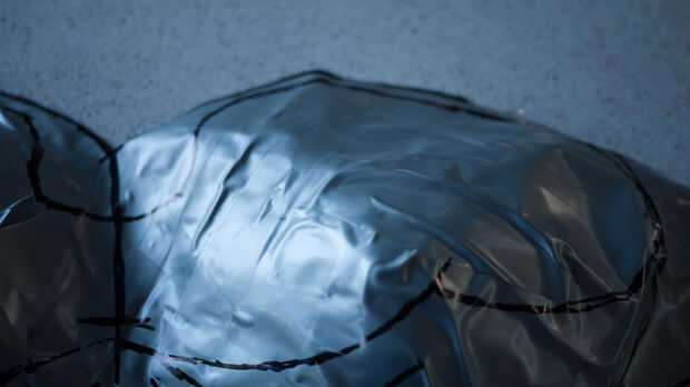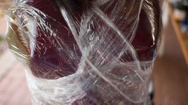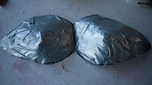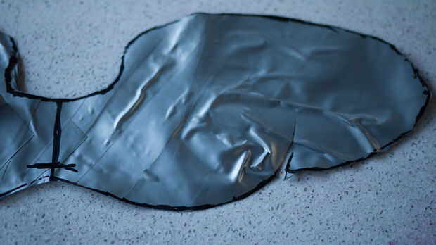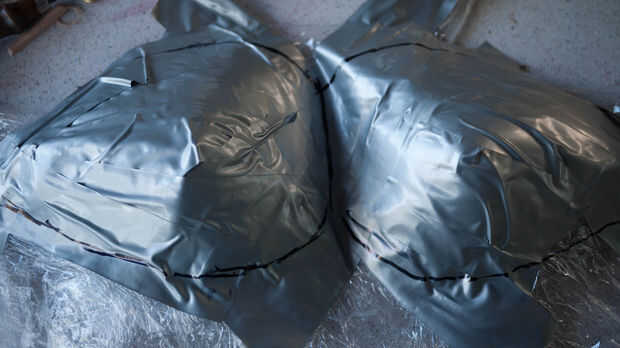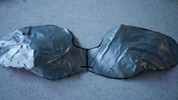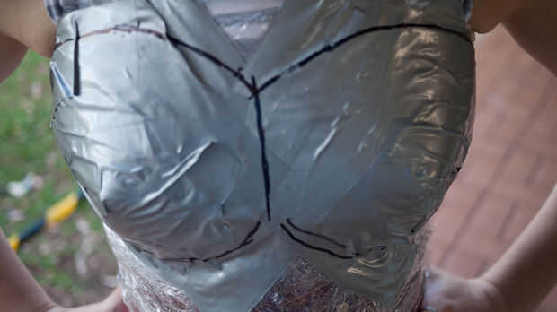 A continuación, envuelva su corsé y comenzar a usar cinta adhesiva para formar alrededor de las tazas. Una vez que esto se logra corta hacia fuera y dibuja su forma básica águila. Corte un pequeño dardo y acoplar esto sobre tu piel a cortar la pieza. Im usando 3mm o 1/8 estampado cuero aquí.