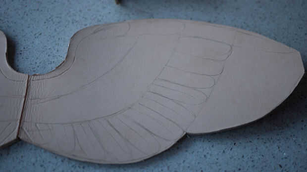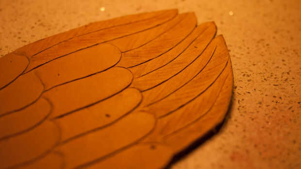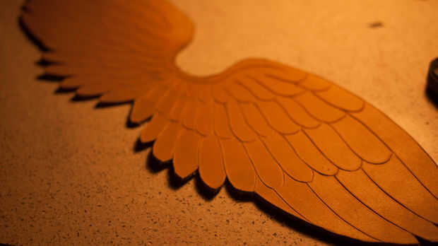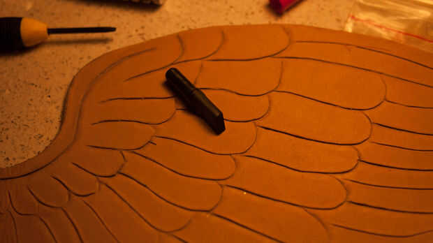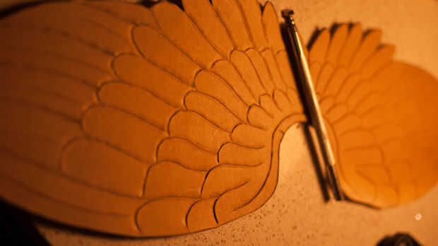 A partir de ahí, a lápiz en sus patrones de la pluma. Dividí el ala para arriba en líneas para dibujar hacia fuera las plumas - parecía que me ayude. A partir en la parte superior del ala más cercana al centro comienzan a girar el cuchillo cada pluma en. Trabajar en esta dirección para crear el efecto de superposición. Ahora utilice la herramienta de biselado para crear cierta profundidad a las plumas. Cortar el cuero ahora por lo que sus formas de pluma crean la frontera.