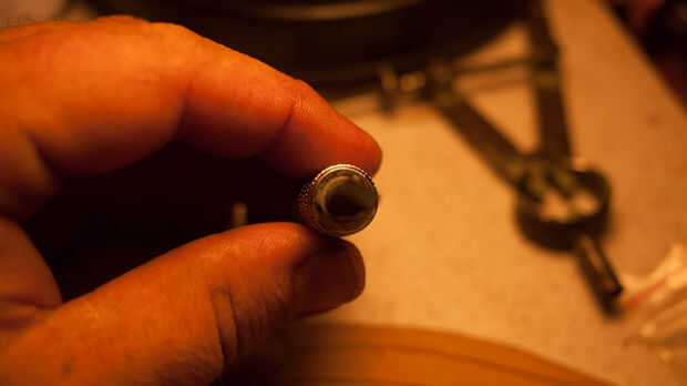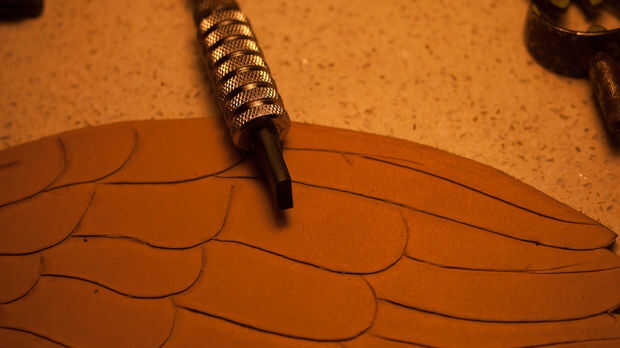 Luego pasa la herramienta de cuchilla giratoria para una punta de herramienta diferente llamada "punta de la trenza". Crea pequeñas, líneas muy finas-perfecto para los patrones de la pluma. Sólo hice las más grandes plumas de punta aquí. Cambiar la punta hacia atrás y crear algunos detalles básicos para las otras plumas. Nota que el cuero debe ser muy húmedo mientras esté usando su cuchillo del eslabón giratorio.