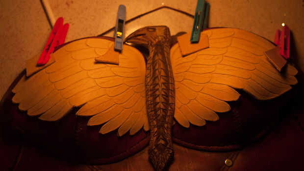 A continuación, utilizar una dremel rueda corte al detalle en todas las plumas de águilas. Use gafas de seguridad! Dremel cortar discos explotan cuando tienen demasiada presión o coger algo y es fácil olvidarse de esto. Una vez mi detalle fue hecho, pegué esta en las alas, controlando su posición en el corsé también.