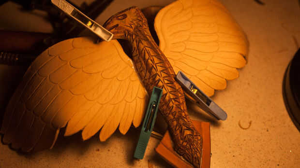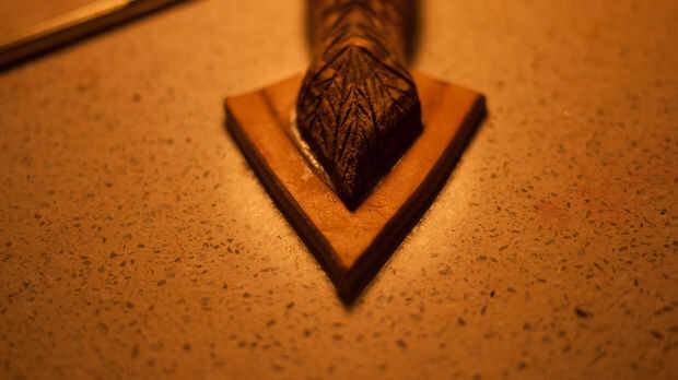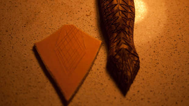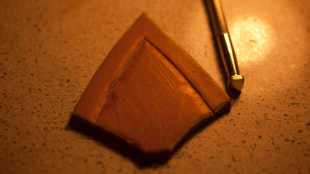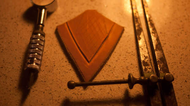 Luego corté un trozo de cuero grueso estampado para la cola. Me esta marcado con separadores y biselado hacia abajo para hacer una forma de escudo. Lo anotó y pegado sobre el águila que se seque.