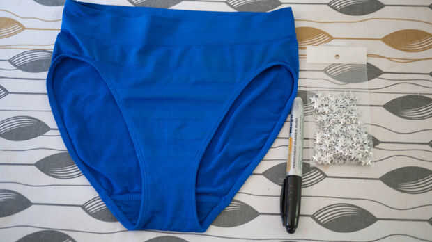 Tengo Hannah a comprar un conjunto de bragas de talle alto. Estos eran una mezcla de poliéster, por lo que son un poco brillante que es lo que quería para este traje. He conseguido estos grandes poco hierro 3D en estrellas de diamantes de imitación que son tan fáciles de hacer y muy permanente.