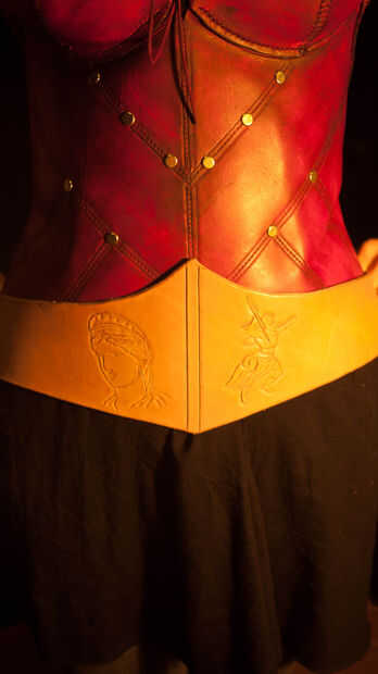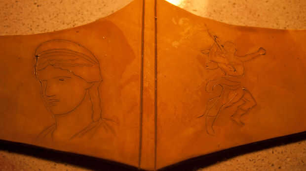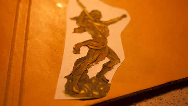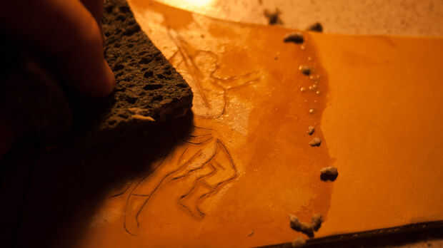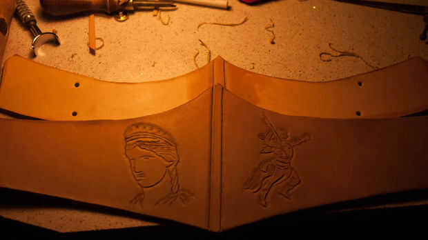 A continuación imprimir algunos diseños y pegarlos en con PVA y cortar el papel para transferir los diseños sobre la piel. Utilicé una hoja de afeitar nueva para esto para asegurarse de que las líneas eran muy precisas. Moje el cuero y desprenda el papel. Yo entonces mano-fileteado estos diseños en la piel con la herramienta de mazo y bisel. Usé una imagen de Veritas (diosa de la verdad - donde el lazo de la verdad puede tener su origen desde) y Zeus.