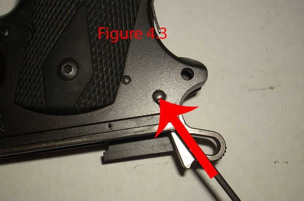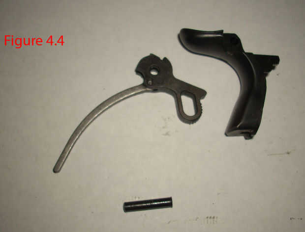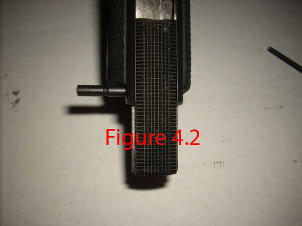 Ahora en la figura 4.4 se puede ver el martillo, martillo de pin y seguridad de agarre sentado allí solo. Thebackstrap llevó a cabo la parte baja de la seguridad de agarre al chasis. Ahora antes de continuar, observe que la barra viene del martillo. Es muy importante, ya que tiene a un asimiento en la correa trasera. ese agujero contiene el pistón y el resorte que impulsa el martillo hacia adelante para golpear el percutor para disparar la pistola. Cuando vuelva a montar el arma, usted va a necesitar para alinee con el agujero en la cintura.